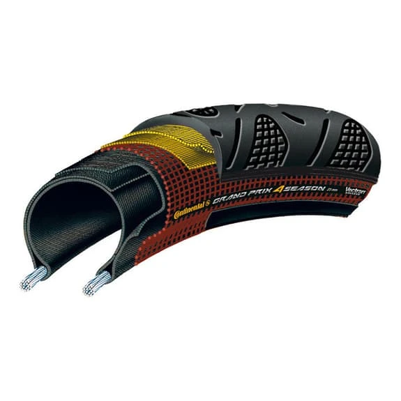 Il copertoncino Continental Grand Prix 4 Season è dotato della tecnologia Vectran, novità della protezione contro le forature. È un filo termoplastico multi fibra a partire da un polimero di cristalli liquidi (LCP). La struttura e le fibre di rinforzo Vectran sono leggere, resistono alle tensioni estreme e all’usura e sono cinque volte più forti dell’acciaio. Vectran protegge il copertone contro forature e tagli. È anche più flessibile.